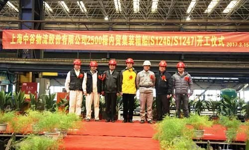 3月15日,上海船(chuan)(chuan)廠在崇明(ming)基地五萬三車間內(nei)舉(ju)行S1246、S1247輪的(de)開工儀(yi)式(shi),兩(liang)艘船(chuan)(chuan)是上海船(chuan)(chuan)廠為中(zhong)谷(gu)物流有限公(gong)司(si)(si)建(jian)造的(de)2500箱內(nei)貿(mao)集裝箱船(chuan)(chuan)。中(zhong)谷(gu)海運集團(tuan)公(gong)司(si)(si)項目經理(li)郭(guo)春輝啟(qi)動按鈕(niu)為S1246、S1247輪建(jian)造開工點火,公(gong)司(si)(si)總經理(li)助(zhu)理(li)劉盛明(ming)、船(chuan)(chuan)東、船(chuan)(chuan)檢(jian)以(yi)及相關部門代表參加儀(yi)式(shi)。