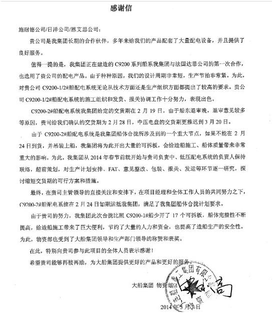 正在(zai)(zai)建造的(de)(de)C9200系列船(9200TEU)是大(da)連(lian)(lian)重(zhong)工與法國達(da)(da)菲公司的(de)(de)第(di)一(yi)次(ci)合作(zuo),選用了我公司的(de)(de)低(di)壓(ya)(ya)配(pei)電(dian)產(chan)品(pin)。此(ci)(ci)項目技術含量高設計(ji)周期(qi)短,而且交貨(huo)期(qi)緊,在(zai)(zai)種種困(kun)難前,恩艾思各(ge)部門齊心協力(li),頂住壓(ya)(ya)力(li),從(cong)設計(ji)、生產(chan)、發貨(huo)及報(bao)關協調等方(fang)面(mian)都(dou)表(biao)現出色(se),按(an)照(zhao)規定的(de)(de)交貨(huo)期(qi)順利交付了產(chan)品(pin),特此(ci)(ci)大(da)連(lian)(lian)船舶重(zhong)工發來感(gan)(gan)謝信來表(biao)達(da)(da)對恩艾思同仁的(de)(de)認可以(yi)及感(gan)(gan)謝。下圖為大(da)連(lian)(lian)重(zhong)工發給NSE的(de)(de)感(gan)(gan)謝信.