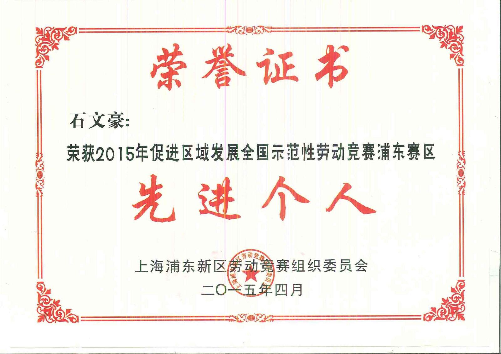 2015年(nian)3月(yue),在由上(shang)海市浦(pu)(pu)東新(xin)區(qu)勞(lao)動(dong)競賽組織委員(yuan)會(hui)舉辦的(de)(de)”2015年(nian)促(cu)進區(qu)域發展全國示范性勞(lao)動(dong)競賽浦(pu)(pu)東賽區(qu)“的(de)(de)評選(xuan)活動(dong)中,上(shang)海恩(en)艾思電氣有限公司(si)工會(hui)提報(bao)的(de)(de)員(yuan)工石文(wen)豪(hao)獲(huo)得(de)了“先進個人(ren)”的(de)(de)稱號。